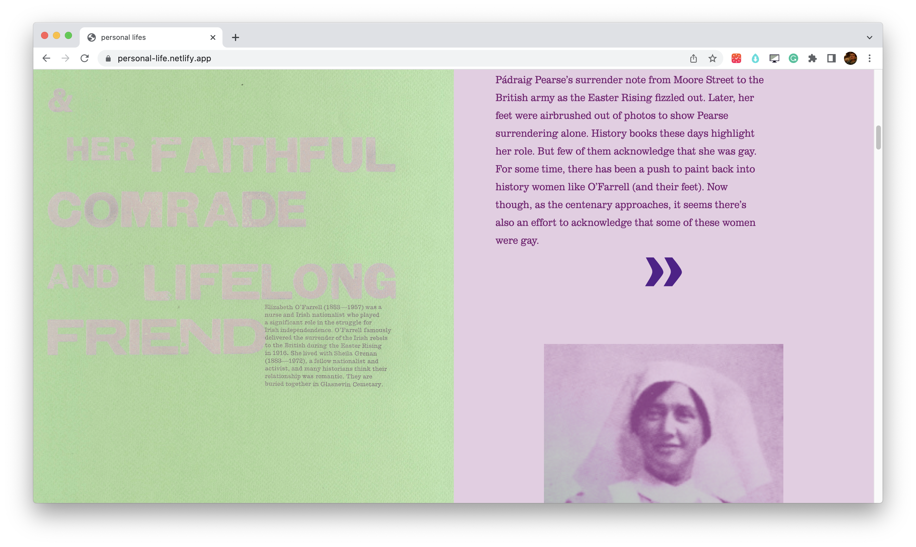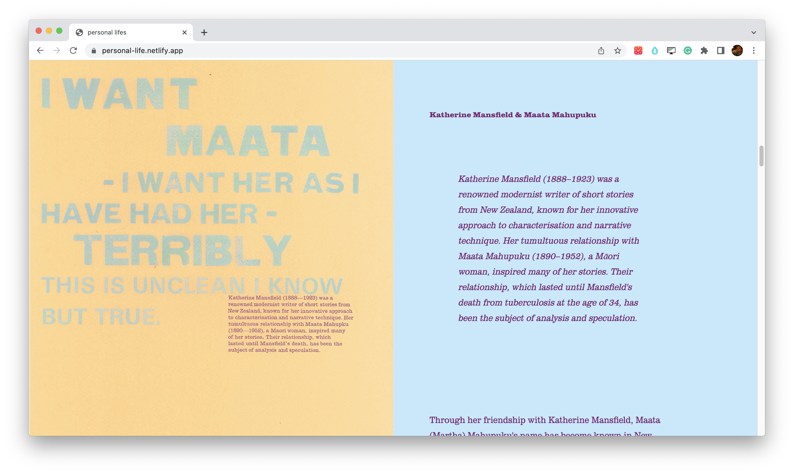 This series of letterpress posters record the phrases that let us into a person's life (and speculated queerness). They are paired with a website to mimic that process of discovery; you hear or see a hint, and go searching to find more information. The website acts a bit like a directory, linking sources, articles, and blogs. It also allows the user to highlight words. The limited run of letterpress prints contrasts with the highlightable and digital website. Allowing for both accessible information but also documenting queer history in a refined way.